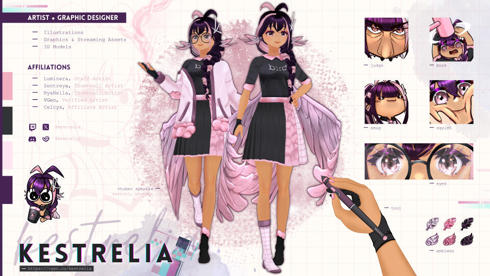 Hello! My name is Kes and I'm a VTuber, artist, and graphic designer. Welcome to my portal page ♡You can find my work profiles above, and socials below. My preferred point of contact is Discord (@kestrelia); please feel free to DM with work-related inquires.